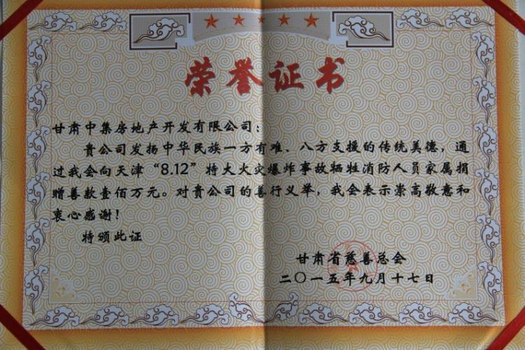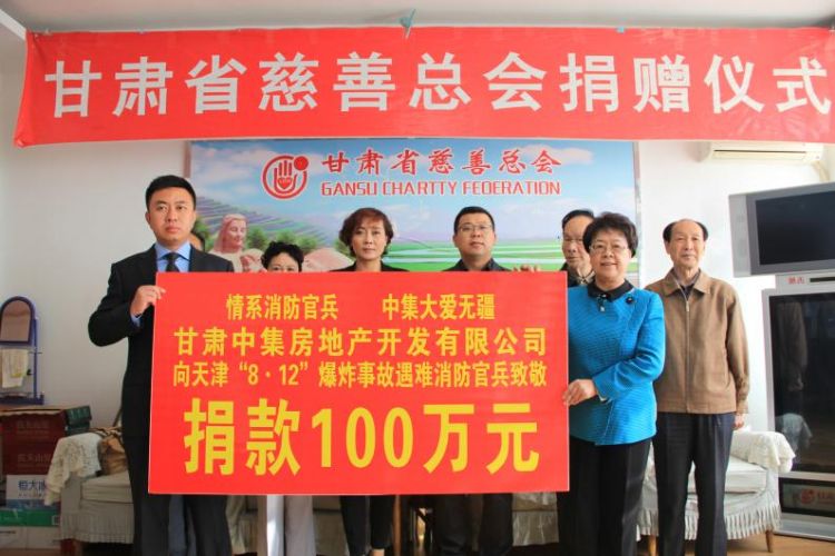 2015年8月12日23時30分,天津濱海新區(qū)國際物流中心發(fā)生重大爆炸火災事故,造成重大人員傷亡。甘肅中集房地產開發(fā)有限公司總經理周啟濤獲悉后,決定為在本次事故中犧牲的消防官兵及其家屬捐款100萬元,用于幫助犧牲消防官兵家屬善后事宜的處理,以盡一份甘肅企業(yè)的慈善愛心。