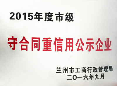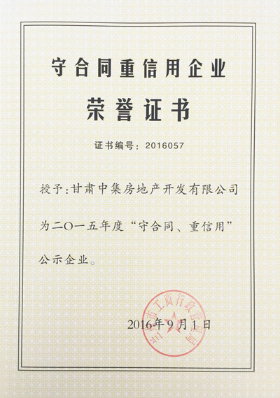 2016年9月1日,由蘭州市工商行政管理局評選的蘭州市2015年度“守合同重信用公示企業(yè)”對社會各界發(fā)布,本次全蘭州市共發(fā)布88個“守合同重信用公示企業(yè)”。甘肅中集實(shí)業(yè)集團(tuán)有限公司子公司甘肅中集房地產(chǎn)開發(fā)有限公司憑借“重誠信、謀發(fā)展”的經(jīng)營發(fā)展模式,喜獲蘭州市2015年度“守合同重信用公示企業(yè)”榮譽(yù)稱號,為甘肅中集集團(tuán)發(fā)展里程再添輝煌。