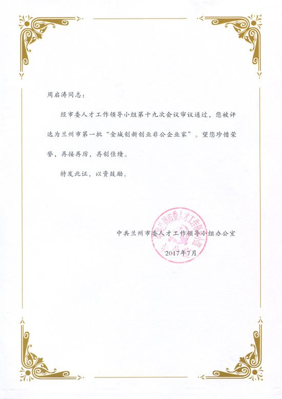 2017年11月22日,甘肅中集實(shí)業(yè)集團(tuán)有限公司董事長(zhǎng)周啟濤榮膺蘭州市首屆“金城創(chuàng)新創(chuàng)業(yè)非公企業(yè)家”;